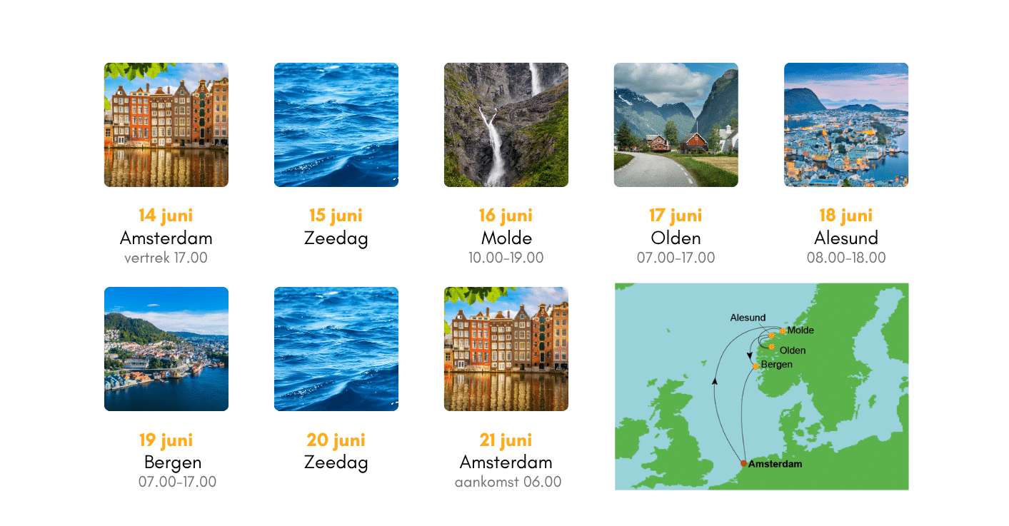 Spelen, relaxen, samen eten en genieten aan boord, terwijl het schip elke dag op een nieuwe bestemming is. We vertrekken vanuit Amsterdam en reizen langs Alesund, Olden, Molde en Bergen. Tussendoor varen we tussen de indrukwekkende fjorden van Noorwegen.