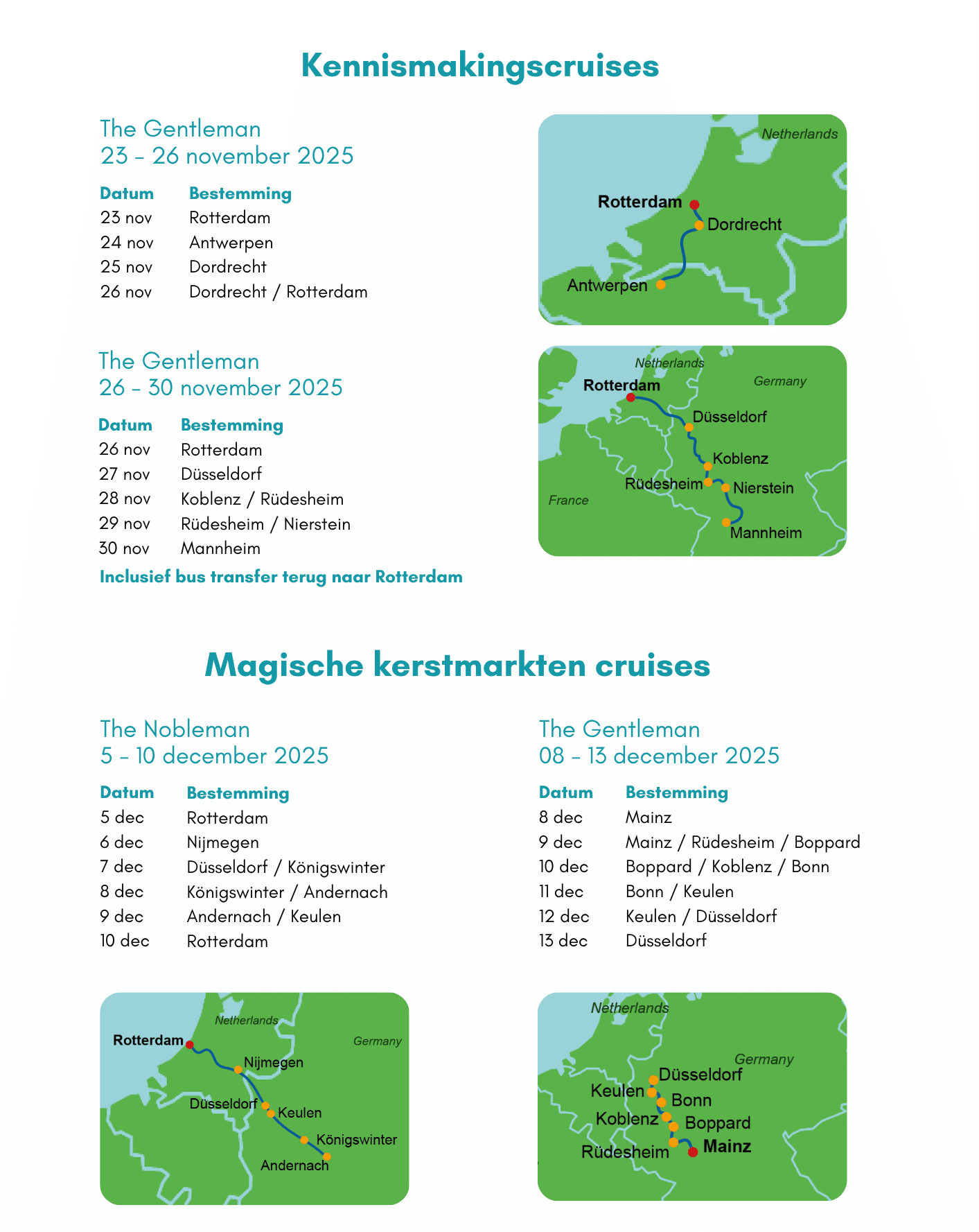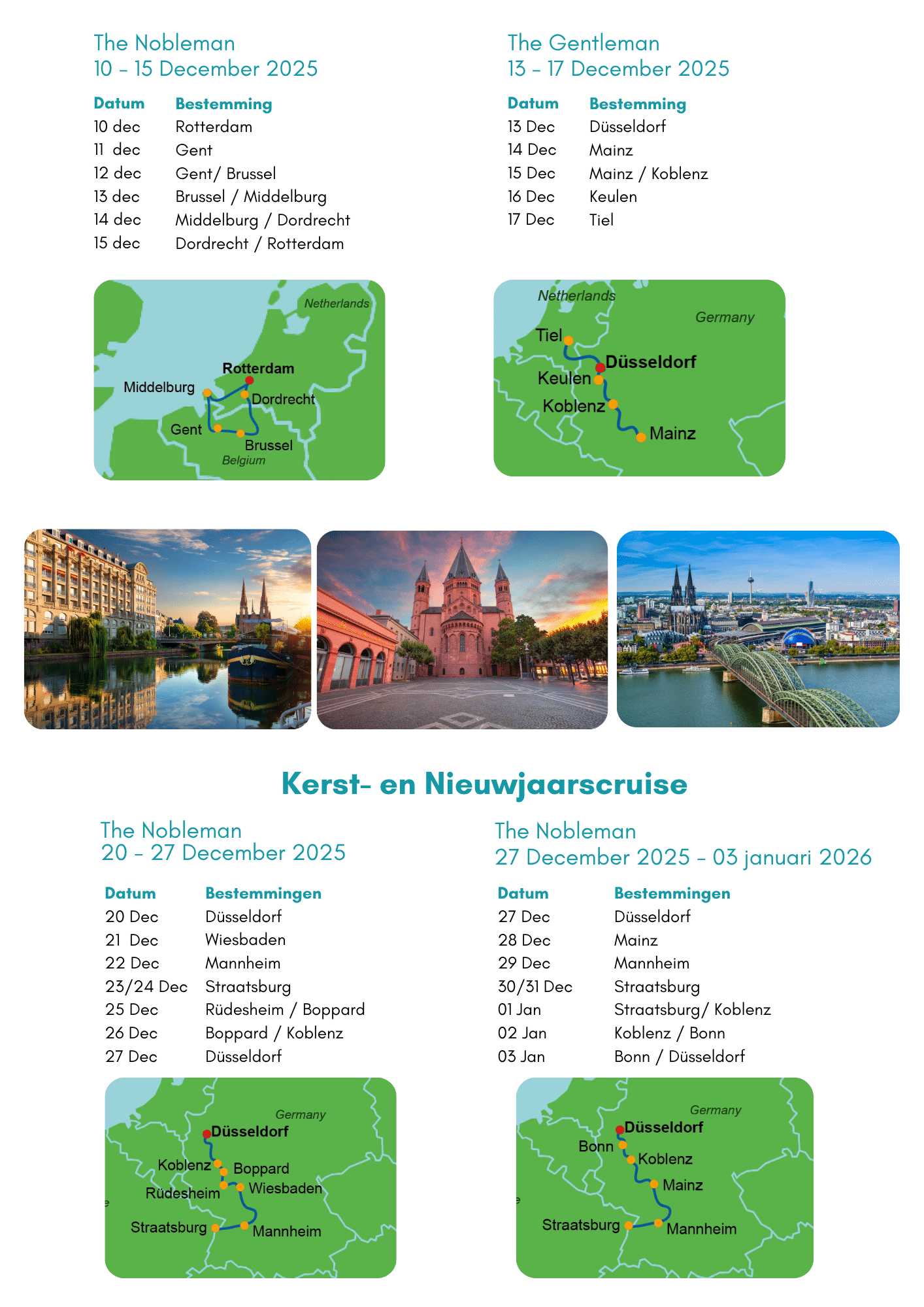 Beleef een onvergetelijke feestperiode aan boord van The Nobleman! Boek de Kerstcruise (20 t/m 27 december 2025) én de Nieuwjaarscruise (27 december t/m 3 januari 2026) samen en geniet van een extra voordelige prijs: de tweede week vaart u mee voor slechts €1.000 extra per persoon