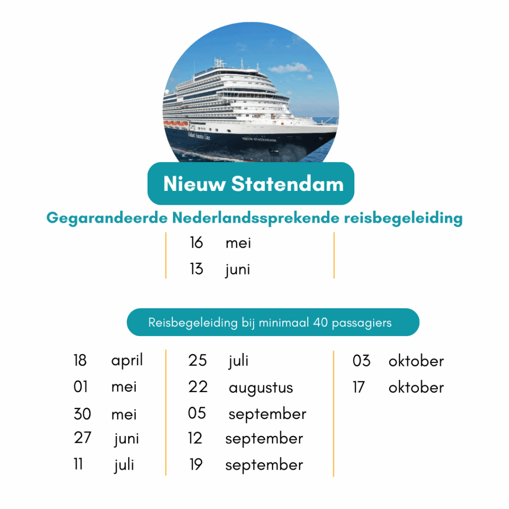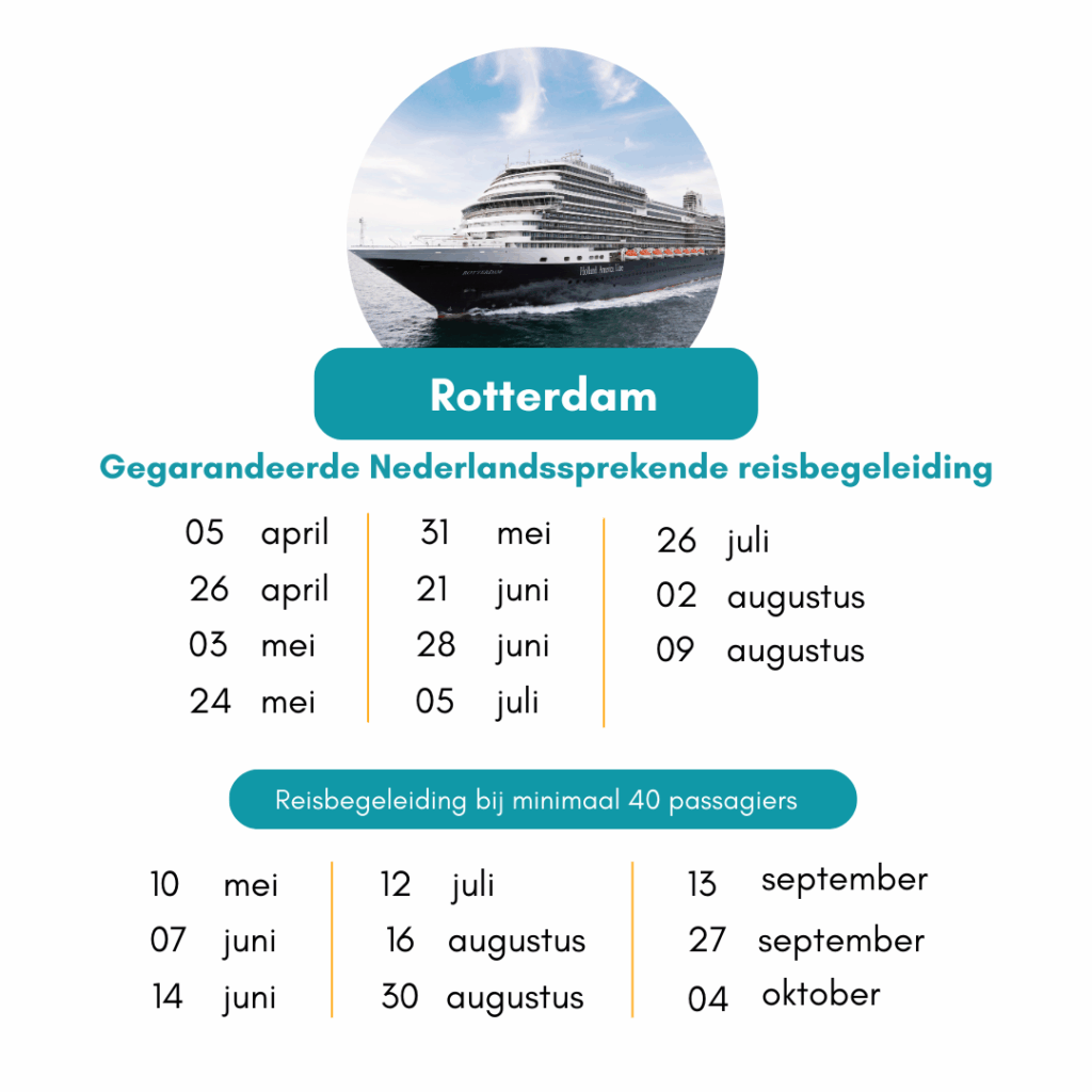 Sinds 2024 organiseren wij reisbegeleiding door cruise experts, wat sindsdien een groot succes is. Daarom zal Captain Cruise ook in 2026 ervaren Nederlandssprekende reisbegeleiding mee laten gaan op alle 8-daagse cruises van Holland America Line met vertrek vanuit Nederland*