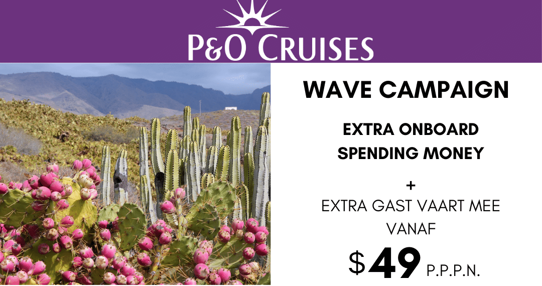 Boek nu uw cruise met P&O Cruises met vertrek tussen 1 januari 2026 en 30 oktober 2027 en profiteer van extra on-board credit. Ook varen extra gasten mee vanaf $49 p.p.p.n. op geselecteerde afvaarten.