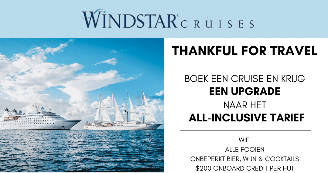 Maak u klaar voor de nieuwe promotie van Windstar Cruises. Profiteer nu van gratis geselecteerde wijnen, bier en cocktails, Wifi en fooien. Geldig op geselecteerde afvaarten.